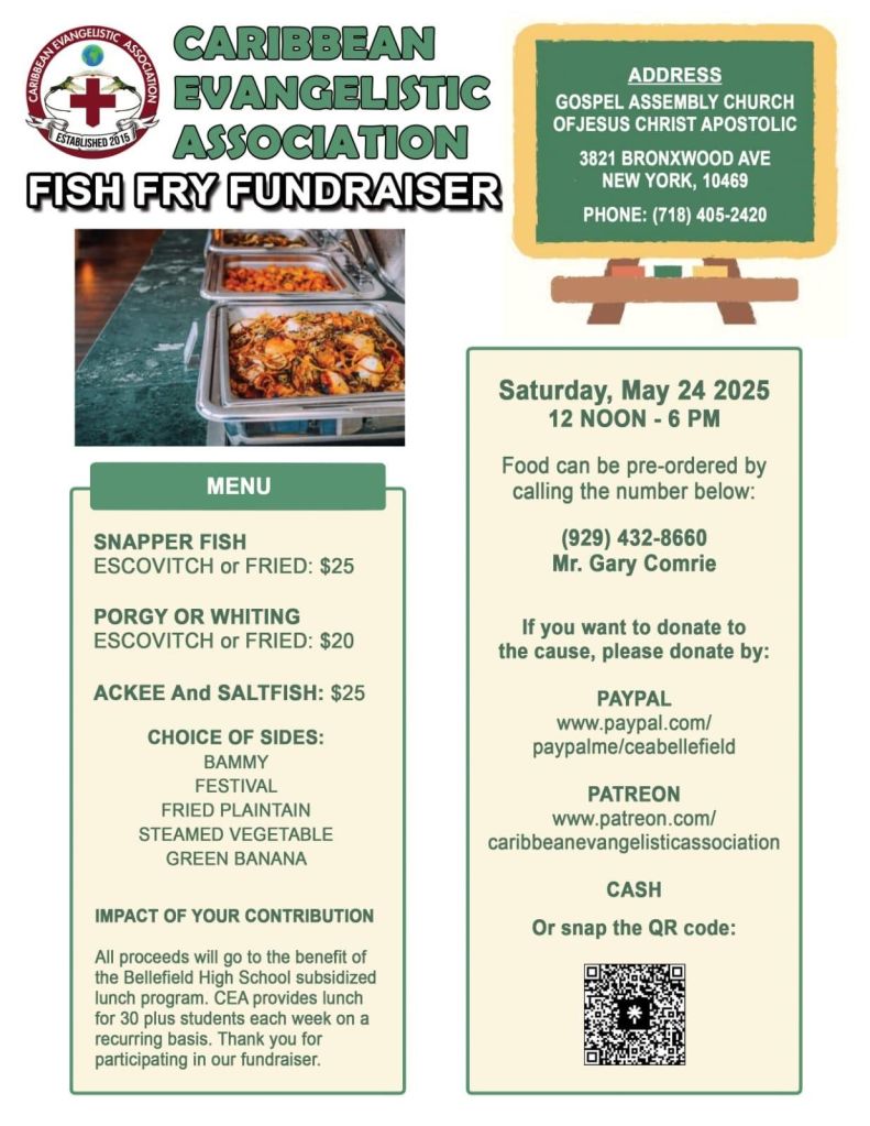 Come Join! At the ending of this month The CEA family will be having a Fish Fry Fundraiser (05/26). Supporters at any level are welcomed, please make note the menu options listed on the flyer. Feel free to share with your friends & family because it’s gonna be worth the trip. All proceeds will go towards supporting the CEA supplemented Lunch Program at Bellefield Highschool in Jamaica. Scan the QR code to see more about our organization, if you have any questions about menu items please text the number listed on the flyer. Thank you in advance, see you at the grill!